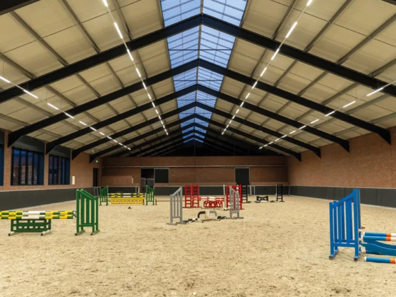 Voor dit project in Schaijk hebben we een schitterende rijhal plus stallen met kantine mogen realiseren.