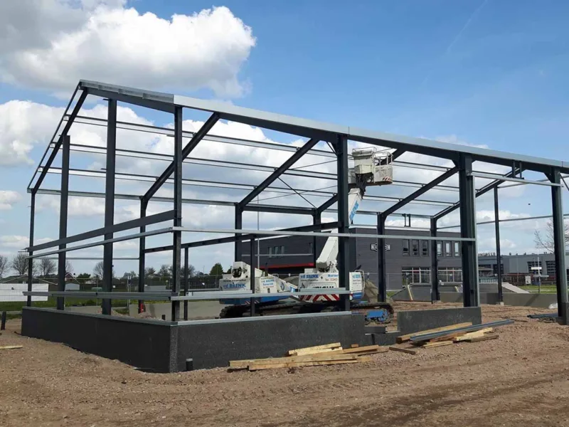 Samen hebben wij een prachtige loods ontworpen, die als functie heeft, stalling van machines, voortuigen en opslag van materialen met een inpandig kantoor.