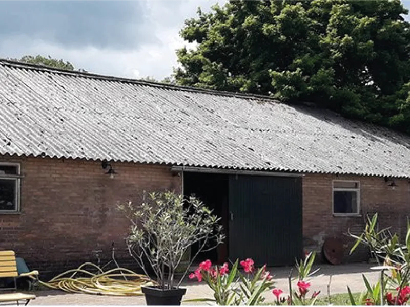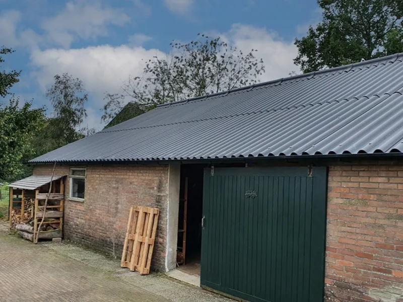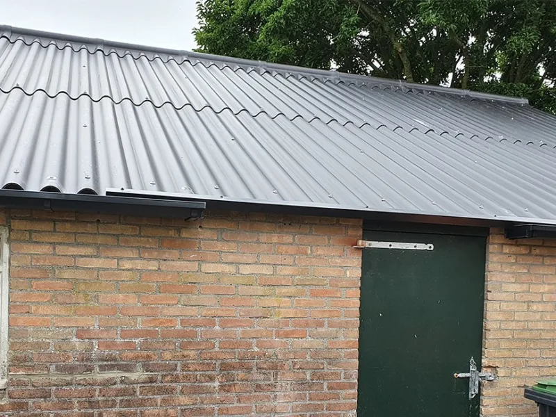 In Dalfsen is een schuur voorzien van nieuwe zwarte Humanit golfplaten. Deze duurzame dakbedekking combineert een moderne uitstraling met een lange levensduur, perfect voor functionele en esthetische toepassingen.