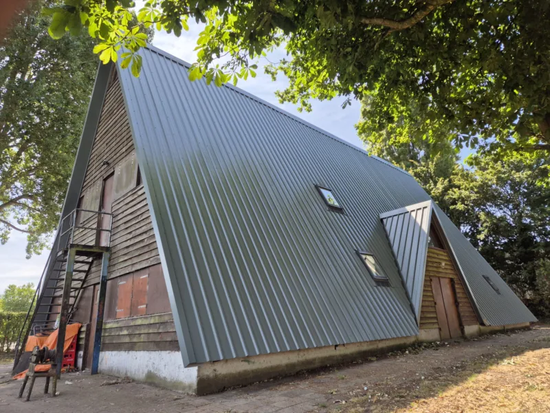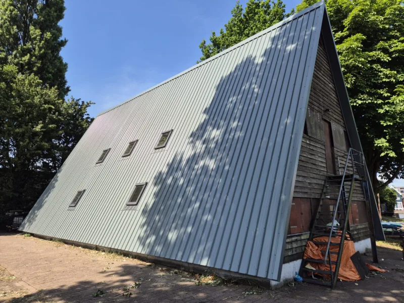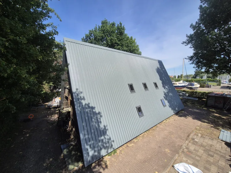In Huizen is een compleet dak vernieuwd. Het bestaande stalen golfprofiel werd verwijderd en vervangen door geïsoleerde dakpanelen, afgewerkt met nokken en windveren. Daarnaast zijn tien Velux dakramen geplaatst, waardoor het gebouw nu een frisse uitstraling en een veel betere isolatiewaarde heeft.