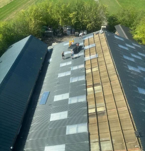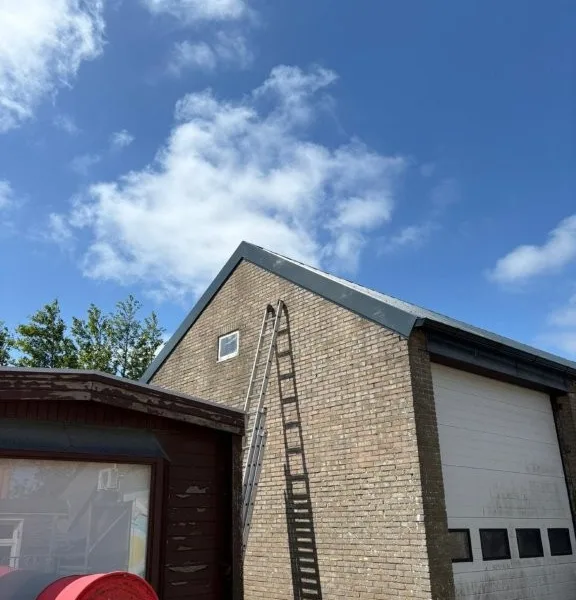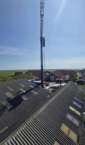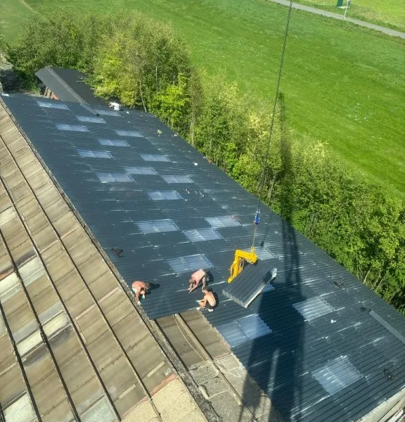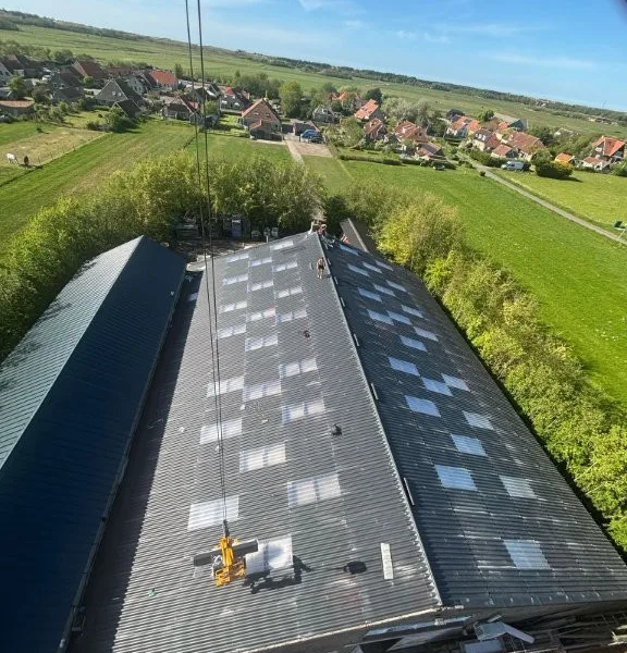 Op Terschelling is een omvangrijke dakrenovatie uitgevoerd, waarbij de logistiek door de eilandlocatie een extra uitdaging vormde. In totaal zijn ruim 1.200 m² asbesthoudende golfplaten verwijderd en vervangen door nieuwe dakoplossingen: één schuur kreeg donkergrijze Humanit golfplaten, de andere geïsoleerde dakpanelen. Daarnaast zijn naadloze aluminium dakgoten en hemelwaterafvoeren aangebracht, is de tussengoot met EPDM duurzaam afgewerkt en is een elektrisch bediende overheaddeur geplaatst. Het resultaat is een veilige, duurzame en toekomstbestendige renovatie.